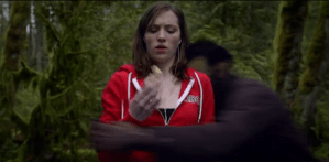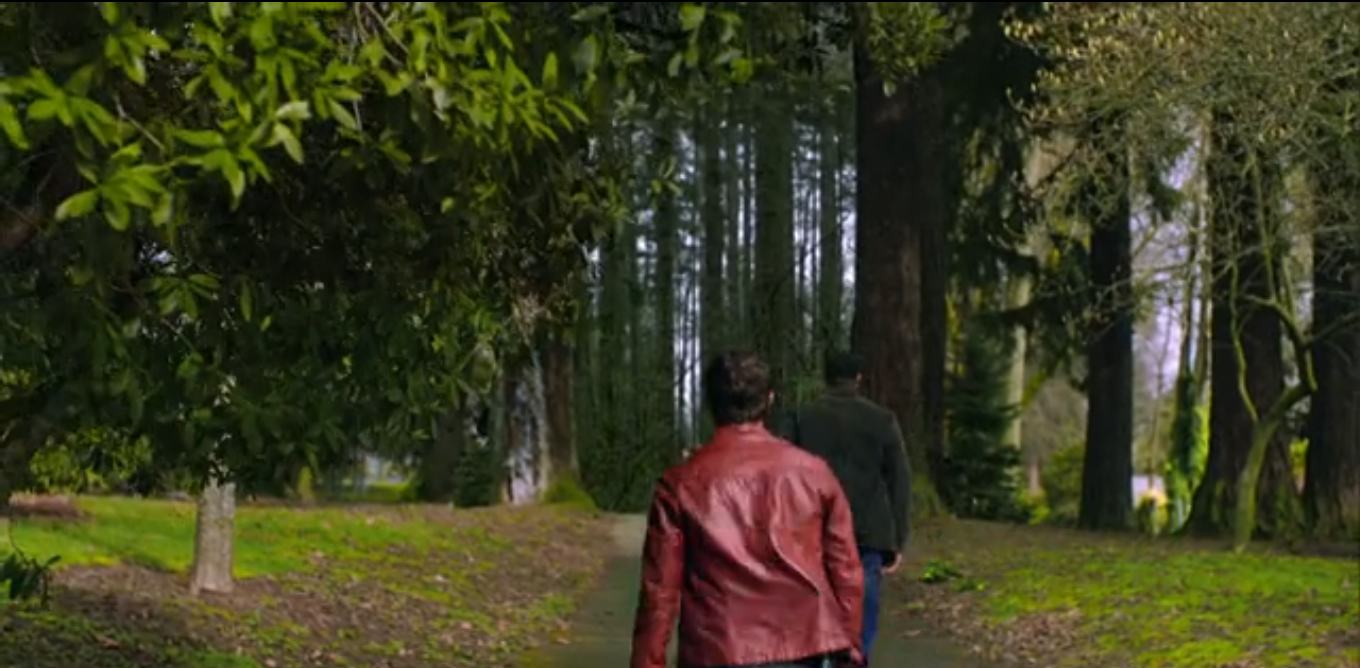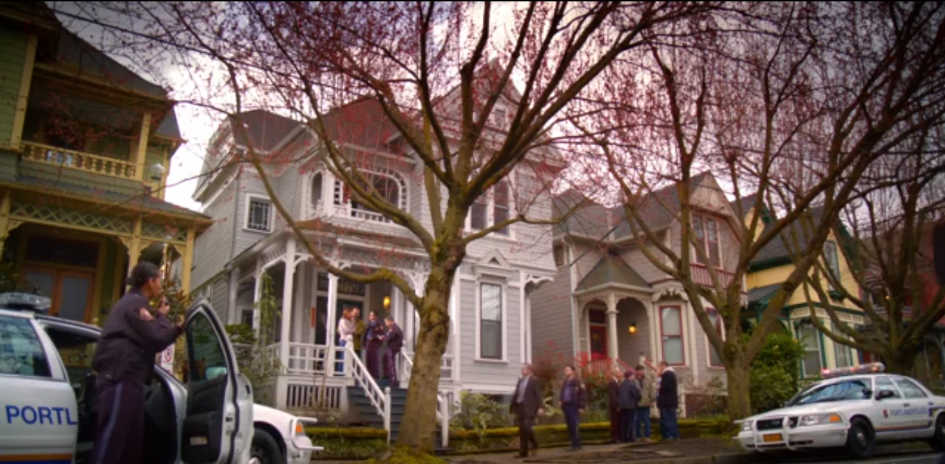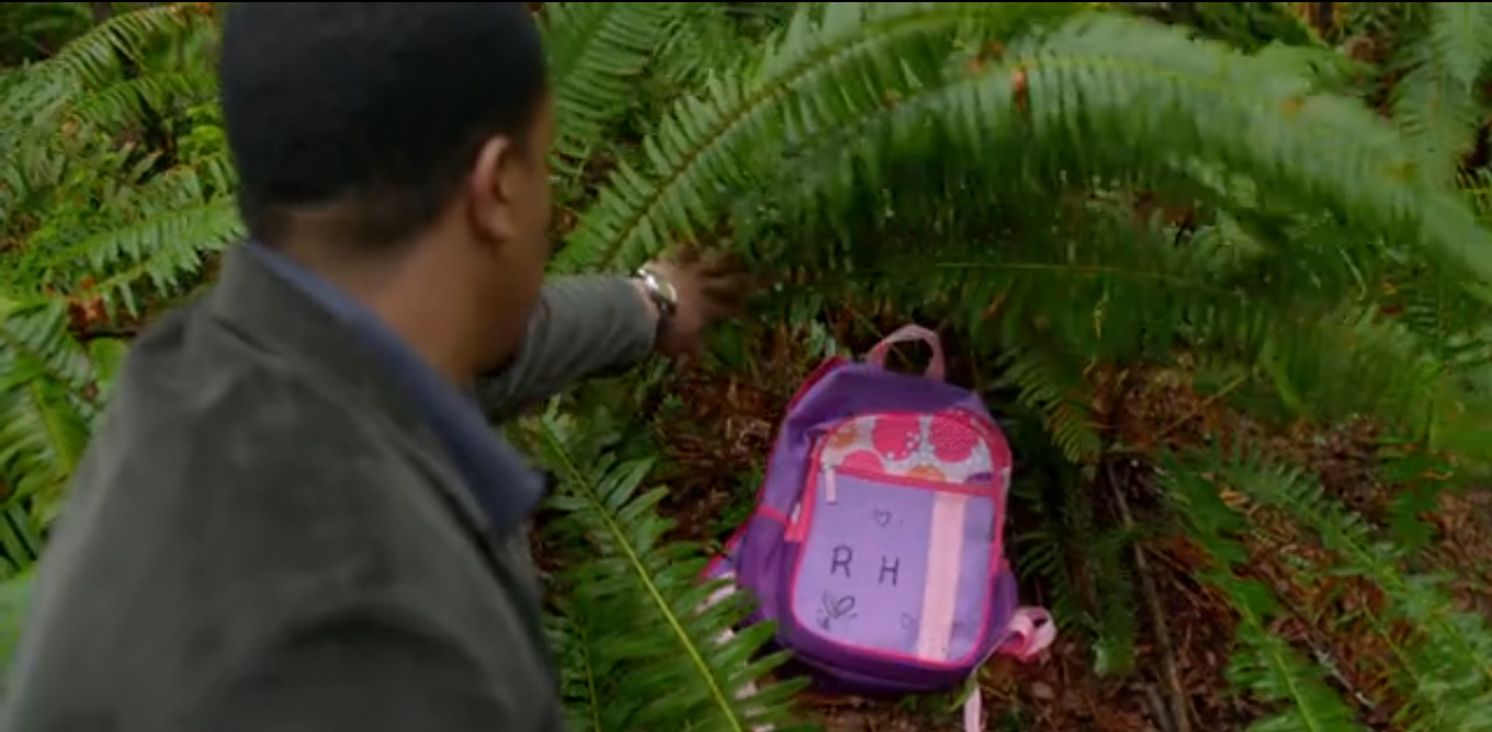 Nick and Hank are in the woods at the crime scene, being shown around by a ranger. One body part is near the trail, and the rest is off-trail. She’s in bits and pieces, and the ranger states they only know it was a woman by the pink woman’s Nike found with the bits (sexist!). Hank asks the ranger what kind of an animal could’ve done this, and he said the interesting thing is that there is only one print they found near the body: a boot print. Nick remarks that it’s similar to something that happened recently in Munson Creek Falls, which was determined to be a bobcat (not wearing boots though). Then he asks Hank if he hears something, and starts following a faint sound of music.