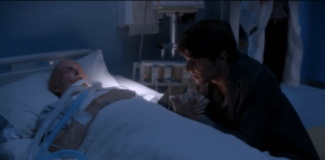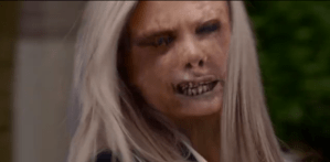 Nick is holding Marie’s hand at her bedside, talking to her while she remains comatose. While he’s talking, a woman in a doctor’s labcoat comes in and prepares a syringe with green liquid. Marilyn Manson’s cover of “Sweet Dreams” starts playing. When she turns to inject Marie, Nick looks up and recognizes her as the blonde. They struggle, and while he prevents her from injecting Marie, she manages to get some into him, turning the world into slo-mo. He slumps to the floor, and she hisses with her distorted face at him as she walks away. Real doctors and nurses rush in to help Marie, but leave Nick on the floor for the moment (which is hilarious).