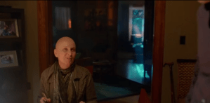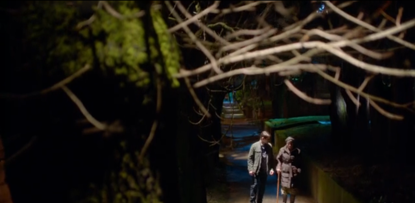Nick pulls up to the house the bald woman went to. There’s a dog barking in the distance, but he is cut off with a yelp. He enters the dark house, calling out for Juliette, and finds the bald woman slowly chopping tomatoes at the kitchen table. She turns and smiles – she is his Aunt Marie. Juliette says Aunt Marie was there when she got home from work, and has been telling some interesting stories about Nick – dead frog in the microwave, really? Aunt Marie apologizes for not giving any advance notice of her visit. Nick asks Aunt Marie how she’s doing, she says she’s not as well as she used to be, and whispers that they need to talk when he hugs her.
