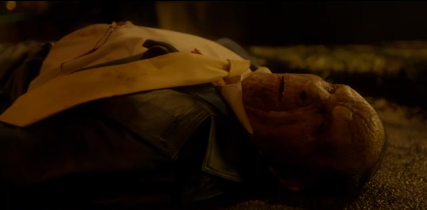 Nick and Hank burst into the cabin, lit only by their flashlights and firelight. The mailman, in his wolf form, tackles Hank, breaking the Hummels (nooooooooooooo). The mailman easily throws Nick across the room and runs out the door. Hank runs to the doorway, shooting him several times in the back. By the time they get close to him his face is normal again, so it’s doubtful Hank managed to see anything strange about him. Nick turns him over and asks where she is. The mailman, wheezing from a punctured lung, says “Grimm” and dies.