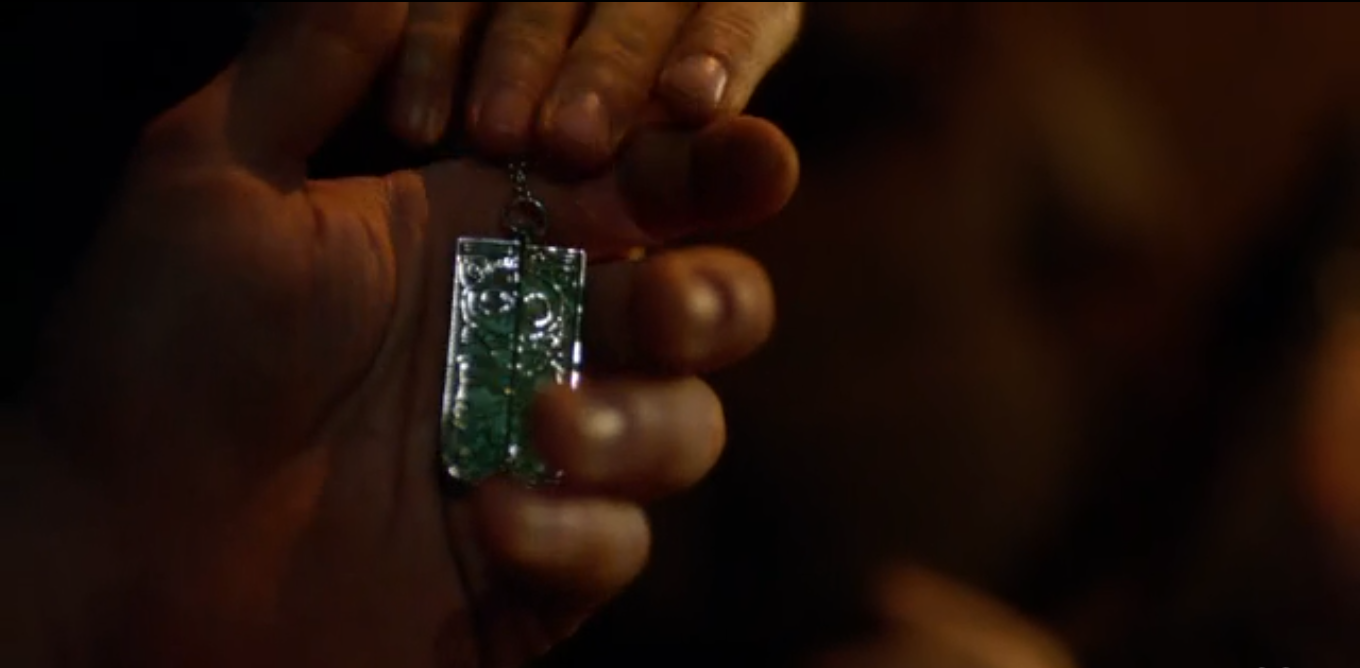 Nick is drawing an extremely detailed head of Hulda when he is approached by a doctor who tells him Marie is conscious. Marie asks him if he saw Hulda, and says that when “they” lose control they can’t hide. She tells him they have the special ability to see things as they really are. “This is no fairy tale. What they wrote about really happened. You are one of the last Grimms.” She tells him everything’s in her trailer, there is so much he needs to learn, and that he is very vulnerable now so he must be careful. The doctor tells him he needs to go now. As he leaves, he looks at the rectangular jade (?) amulet. It splits in half and reveals the inside part is a key. Everything is covered over with swirly carvings.