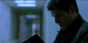 Nick and Hank walk into a government building, talking about running searches in predator databases and checking into the Munson Creek Falls attack while they wait for DNA results on the victim/attacker. They walk into the Portland Police Bureau, which means they are definitely in Oregon. Hank takes the iPod for prints as we follow Nick. A perp is being questioned at an officer’s desk; his face distorts and he has a lizardy look with a long tongue before he returns to normal. Staring, Nick bumps into Sgt Wu, who (I’m calling it now) is going to be the annoying sarcastic competitive character.