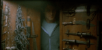 The mailman is covering up the trapdoor with its rug and table again. Classical music is softly playing, and the Hummels are on shelves on the wall. He straightens up, sniffing, his body and face tense. He turns towards the door before Nick uses the door knocker (in the shape of a man). He pleasantly greets them, and asks if he can help them. Hilariously, they both look down at his feet (now in tan moccasins) and look at each other. Hank introduces them as police officers and the mailman invites them in.