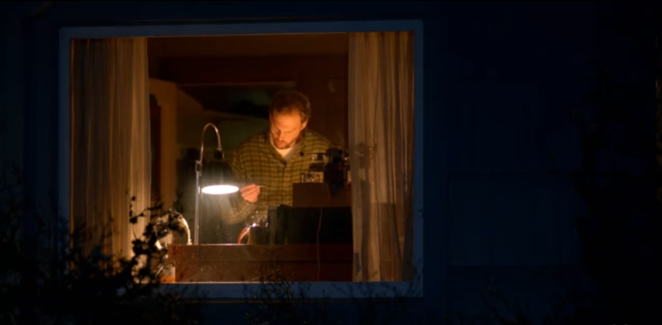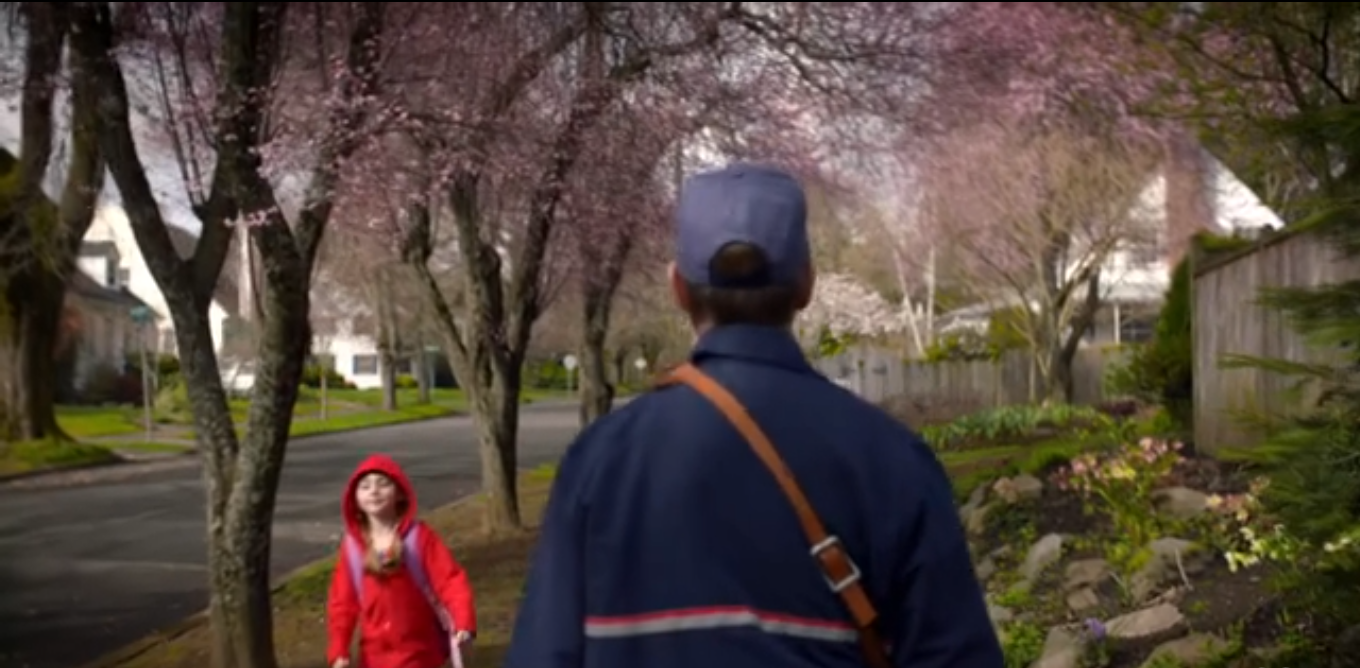 We cut to a mailman slowly walking his route in the very boots we’re looking for. We only see him clearly from the back – he is kept out of focus from the front. As he walks away from the camera, a little girl in a red hoodie skips towards us. As she passes him, the mailman stops, then turns and follows her.
