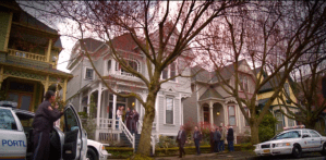 Nick wanders around listening to choice bits of Aunt Marie voiceover and getting freaked out by every little sound in the woods. Hank, meanwhile, finds a girl’s backpack and calls his partner over for a look. Hank calls in the crime scene while Nick looks around. He finds the same bootprints in the mud and runs through the woods after them, emerging onto a street in a more dilapidated neighborhood than the side they entered.