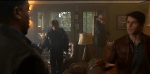 He tells them they can sit in the room with the trapdoor. Hank picks up one of the throw pillows, saying how nice it is. The mailman says he did the needlepoint himself, “Not that I tell everyone.” A buzzer goes off. “Potpie’s done.” He says he’ll just be a moment to get it out of the oven, and then they can talk. After he leaves, Hank turns to Nick. “Are you kidding me?” Nick says he’s sure this is the guy, and Hank sighs and goes into the kitchen, interrupting the mailman from smelling the potpie. His red eyes turn back to blue as he gets control of himself and turns around with a smile.