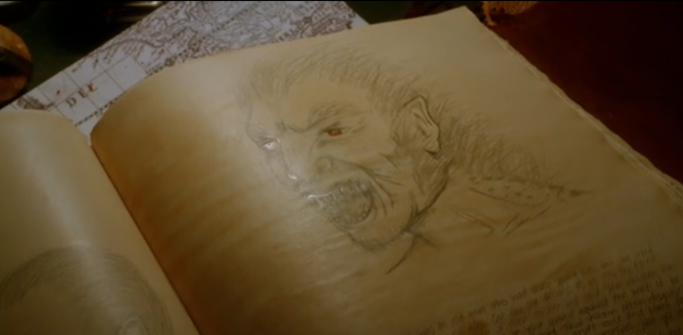 Nick has a dream: Juliette is running through the forest in a red satin dress and is attacked by Hulda. He can’t sleep, so he goes to check out Marie’s trailer. Apparently Grimms are also related to Time Lords, because that trailer is much bigger on the inside. It also is packed with things on shelves and a desk is set up in the middle with all sorts of things that will fall over or down anytime you hit a bump in the road or make a turn. I totally want to live in it. Nick opens a cabinet and finds a medieval arsenal of knives, swords, maces, hammers, axes, a metal net…he closes it again without comment. On the desk is a leatherbound manuscript/scrapbook. It appears to be part family history, part monster encyclopedia. If the drawings in her are Marie’s, they share artistic talent too. Nick recognizes the blonde he saw that morning as a Hexenbiest, and Juliette jumpscares him. As they walk back into the house she asks him how long he lived with Marie. He says she was his mother from the time he was 12 (when his parents died). Juliette asks if they lived in the trailer, but Nick didn’t know she had it. A cat yowls, scaring Nick. Juliette tells him it’s just a cat, and he says “yeah.” They go inside. A growling is heard by the audience.