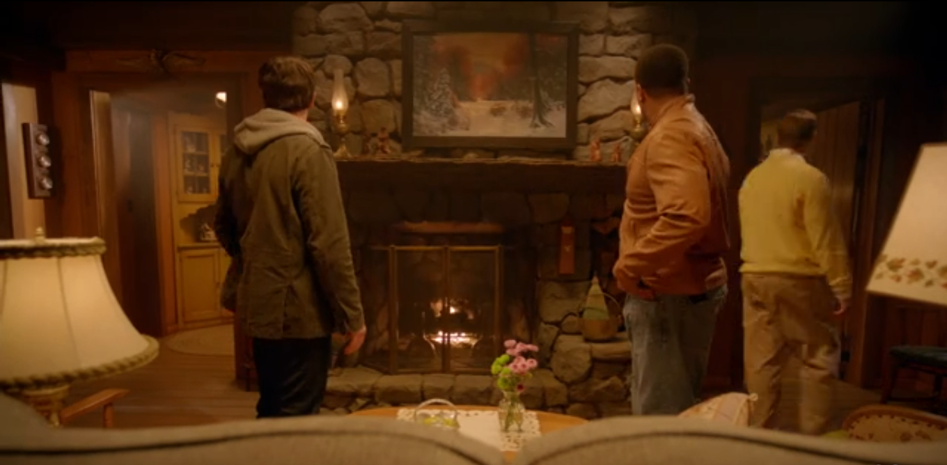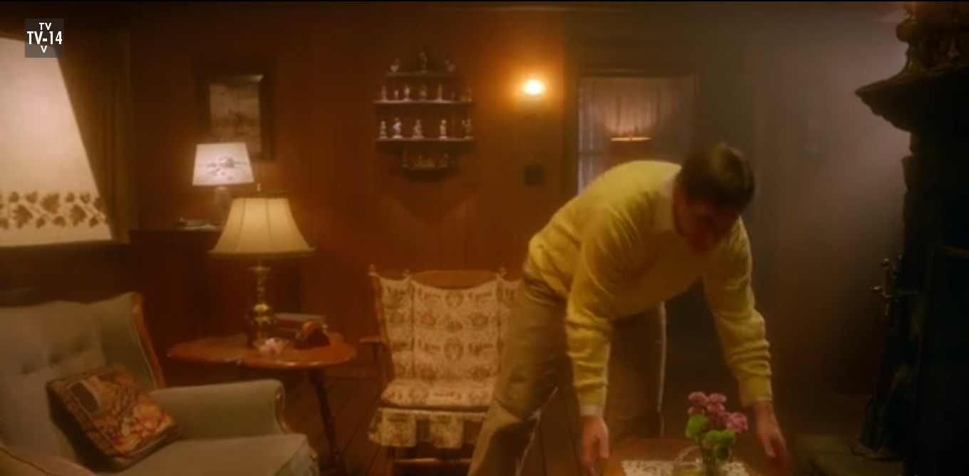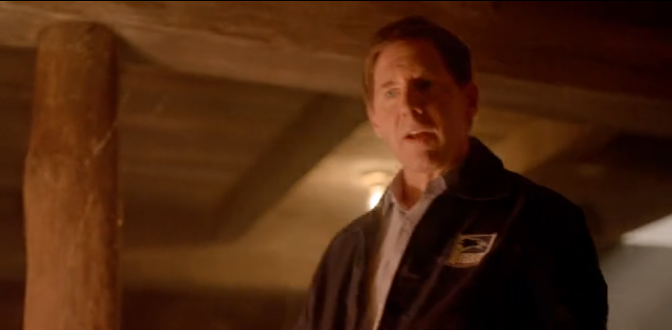 Through some overly polite conversation, the only interesting bit being the mailman’s insistence he’s just like them (government worker), they establish that they’re looking for a little girl who went missing, and a pair of boots led them to him. He tells them with a smile to search everywhere they like. Nick desperately looks in the bedroom closet. By Hank’s exasperation we know they’ve searched the rest of the little cabin. Hank tells Nick he’s leaving now so he can keep his job. Nick follows him out, frustrated. The mailman is standing by the fireplace, humming. He asks if there’s anything else they need, but Hank says they’ll see themselves out. Nick and the mailman exchange a look as he goes out the door.