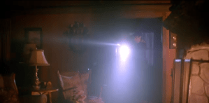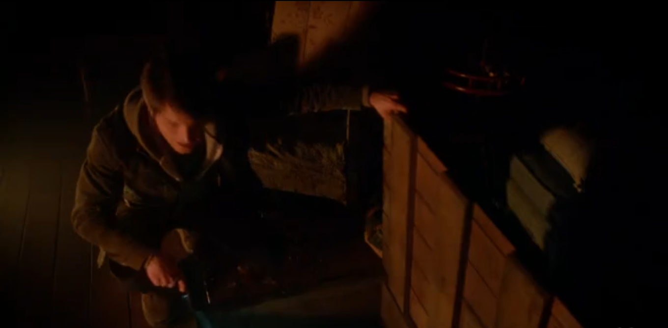 Hank is woken up by a phone call from Nick. “I found her.” The mailman is standing over his fireplace, obviously burning the boots there though we do not see them. He smells something (though I don’t know how you can smell anything over burning rubber), and looks out the window at the empty woods. Suddenly there is knocking. It is the little girl knocking on the trapdoor. He opens it up and she again says she just wants to go home. He growls at her, “I told you, you are home!”