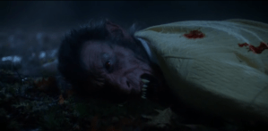 Monroe is peeing on his own fence, and walks to the side as he’s doing it so he can get the whole length. Nick’s face hilariously changes from afraid to confused to horrified. Monroe seems to smell something, so he finishes, zips up, and hurries back into the house. Nick is left not knowing what to do as the lights inside go out. Suddenly Monroe crashes through the window, throwing Nick against the house and growling at him that he shouldn’t have come back. He changes his face back to normal as Nick tries to get his gun out, telling him he’s just making a point, and invites him inside for a beer. “And by the way, you’re paying for that window.”